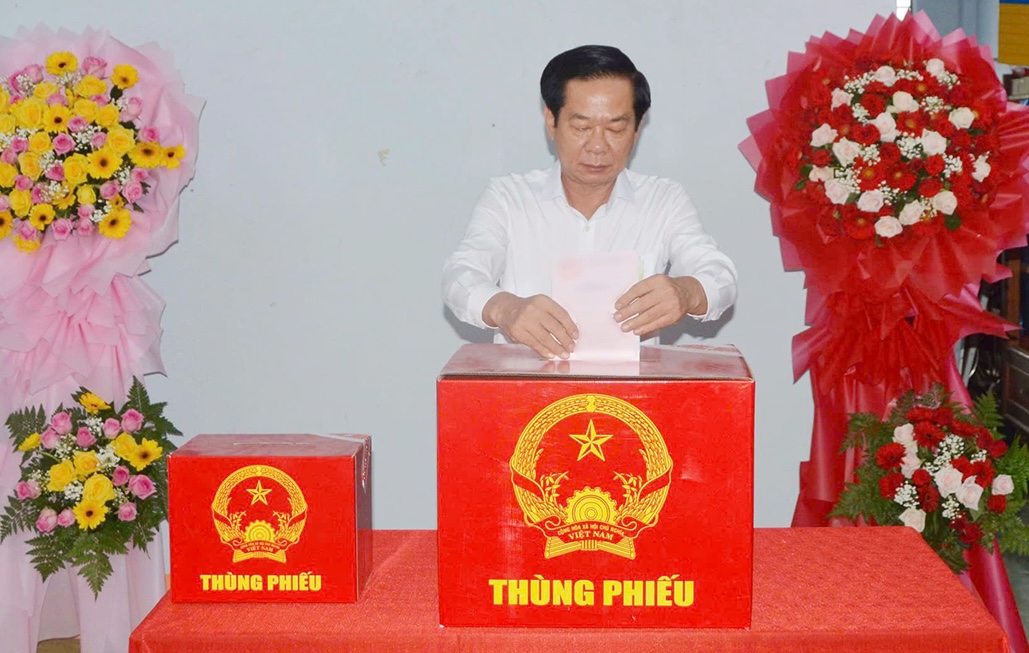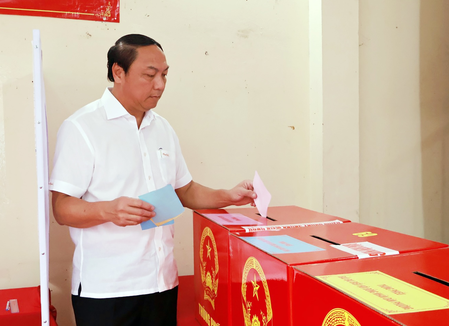 Đồng chí Hồ Văn Mừng, Uỷ viên Trung ương Đảng, Phó Bí thư Tỉnh uỷ, Chủ tịch Uỷ ban nhân dân tỉnh, Chủ tịch Uỷ ban Bầu cử tỉnh An Giang, bỏ phiếu bầu cử tại khu vực bỏ phiếu số 39, khóm Đông An 2, phường Long Xuyên. Ảnh: TCCT