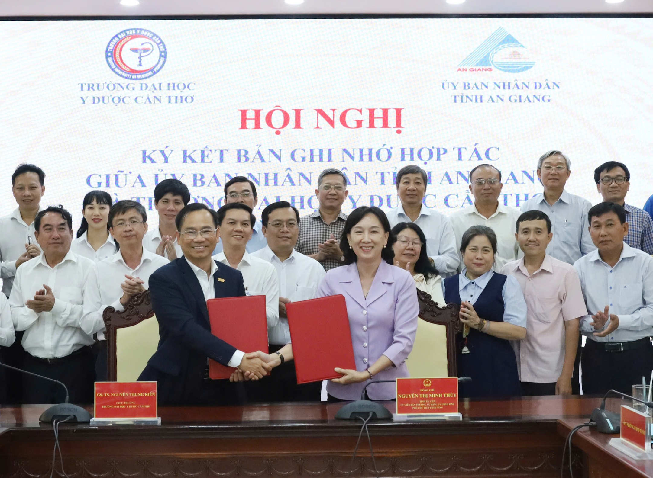 Đồng chí Nguyễn Thị Minh Thúy, Tỉnh uỷ viên, Phó Chủ tịch UBND tỉnh An Giang và Giáo sư, Tiến sĩ, bác sĩ Nguyễn Trung Kiên, Hiệu trưởng Trường Đại học Y Dược Cần Thơ đồng chủ trì hội nghị ký kết bản ghi nhớ hợp tác giữa UBND tỉnh An Giang và Trường Đại học Y Dược Cần Thơ, giai đoạn 2026-2030 (ảnh).