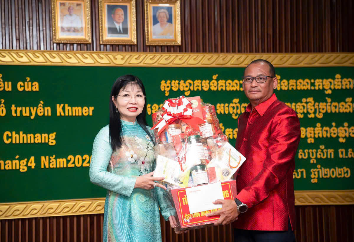 Đồng chí Trần Thị Thanh Hương, Phó Bí thư Tỉnh ủy, Chủ tịch Ủy ban Mặt trận Tổ quốc Việt Nam tỉnh An Giang, tặng quà chính quyền và nhân dân tỉnh Kampong Chhnang, Vương quốc Campuchia.