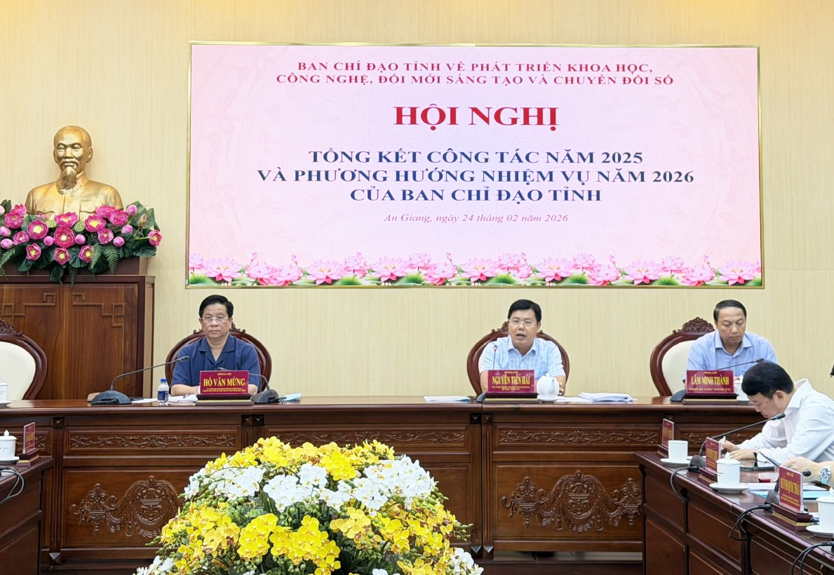 Đồng chí Nguyễn Tiến Hải, Ủy viên Trung ương Đảng, Bí thư Tỉnh ủy An Giang (giữa), chủ trì Hội nghị tổng kết năm 2025 và phương hướng, nhiệm vụ năm 2026 về phát triển khoa học, công nghệ, đổi mới sáng tạo và chuyển đổi số.