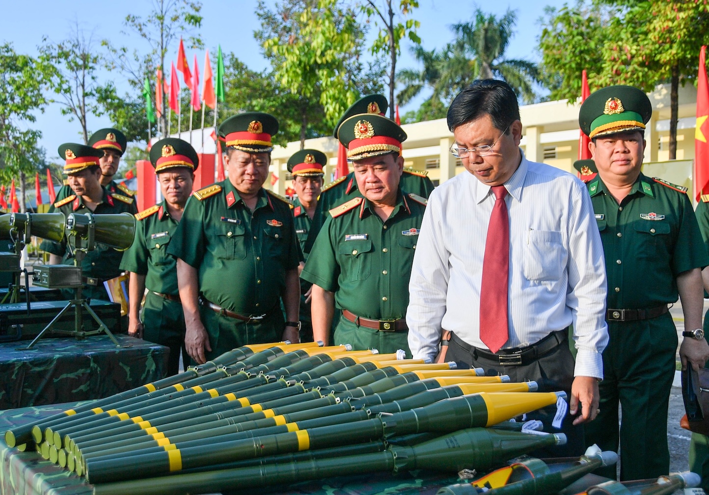Đồng chí Nguyễn Tiến Hải, Uỷ viên Trung ương Đảng, Bí thư Tỉnh ủy An Giang, Bí thư Đảng ủy Quân sự tỉnh, tham quan mô hình, học cụ chuẩn bị huấn luyện năm 2026.