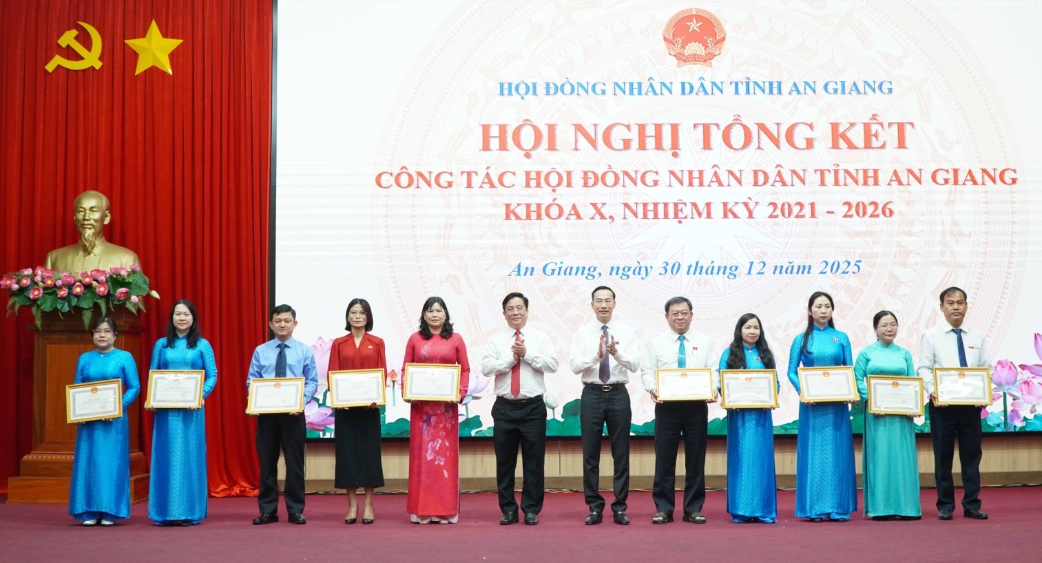 Ngày 30/12/2025, HĐND tỉnh An Giang tổ chức Hội nghị tổng kết công tác nhiệm kỳ 2021-2026. Dự hội nghị có các đồng chí: Nguyễn Thanh Nhàn, Phó Bí thư Thường trực Tỉnh ủy, Chủ tịch HĐND tỉnh; Hồ Văn Mừng, Ủy viên dự khuyết Trung ương Đảng, Phó Bí thư Tỉnh ủy, Chủ tịch Uỷ ban nhân dân tỉnh; Lâm Minh Thành, Phó Bí thư Tỉnh ủy; Trần Thị Thanh Hương, Phó Bí thư Tỉnh ủy, Trưởng đoàn Đại biểu Quốc hội tỉnh, Chủ tịch Ủy ban Mặt trận Tổ quốc Việt Nam tỉnh; các đồng chí là Thường trực HĐND tỉnh, Thường trực Uỷ ban nhân dân tỉnh và đại biểu HĐND tỉnh. Nhiệm kỳ 2021-2026 củaHĐND tỉnh khép lại với nhiều dấu ấn nổi bật về năng lực thích ứng, tinh thần đổi mới và quyết tâm nâng cao chất lượng hoạt động; khẳng định vai trò “trung tâm quyết nghị” trong phát triển địa phương của HĐND tỉnh.
