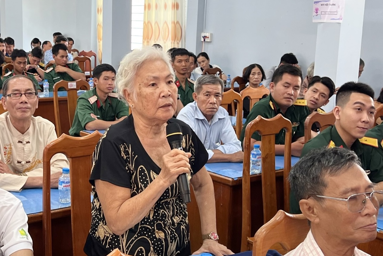 Cử tri phường Bình Đức phát biểu ý kiến với các ứng cử viên đơn vị bầu cử số 2. Ảnh: AGO
