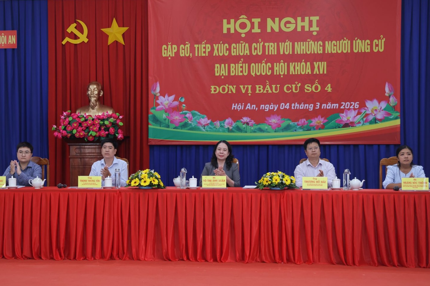 Từ ngày 02-04/3/2026, đồng chí Võ Thị Ánh Xuân, Bí thư Trung ương Đảng, Phó Chủ tịch nước, Phó Chủ tịch Hội đồng Bầu cử Quốc gia và các ứng cử viên đại biểu Quốc hội khóa XVI, đơn vị bầu cử số 4 của tỉnh An Giang, tiếp xúc cử tri các phường Long Xuyên, Bình Đức, Mỹ Thới và các xã Chợ Mới, An Châu, Cần Đăng, Hội An, Long Kiến, Long Điền, Mỹ Hòa Hưng, Cù Lao Giêng, Vĩnh An, Vĩnh Hanh, Bình Hòa, Nhơn Mỹ, để thực hiện vận động bầu cử theo quy định của pháp luật.