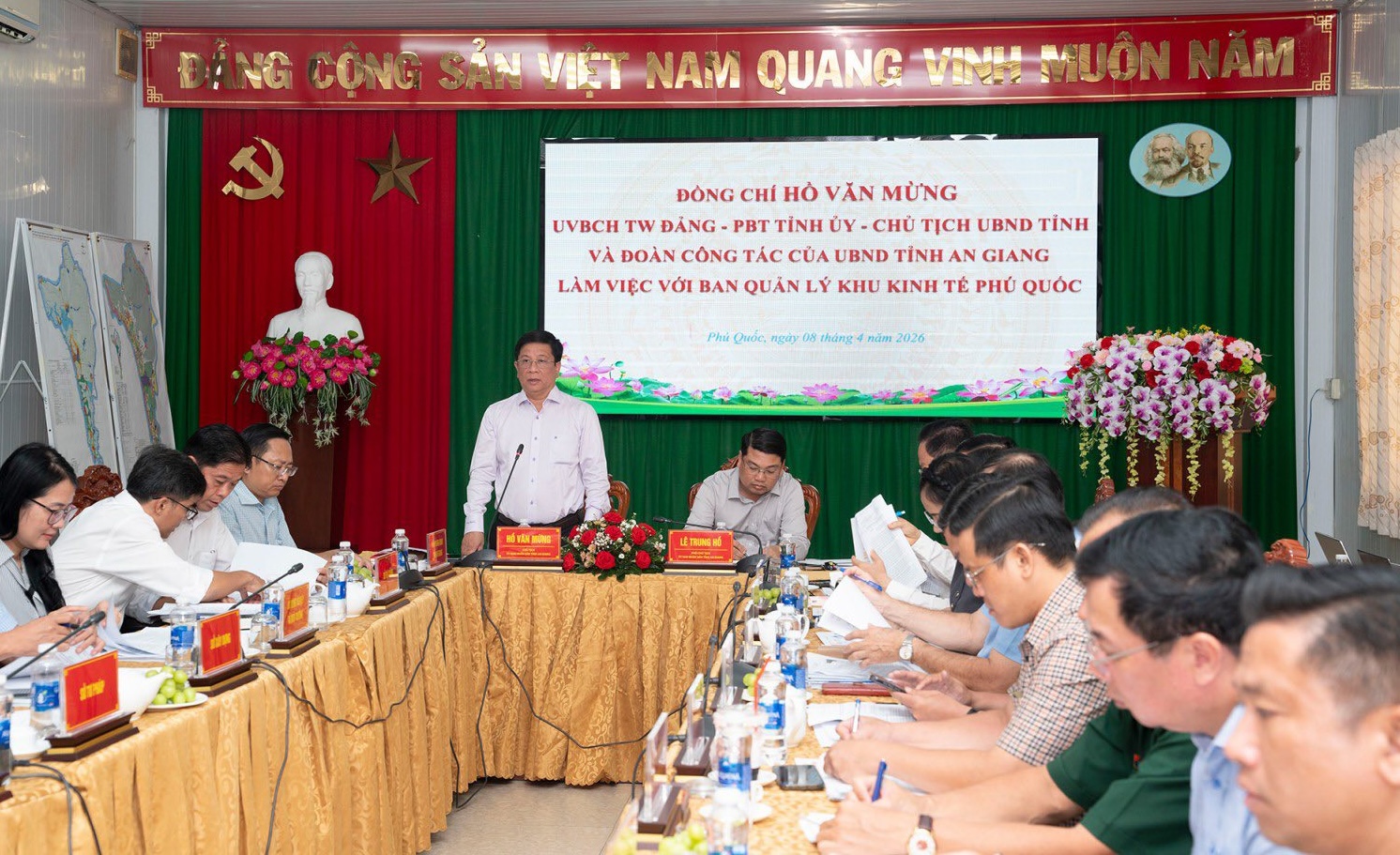 Đồng chí Hồ Văn Mừng, Ủy viên Trung ương Đảng, Phó Bí thư Tỉnh ủy, Chủ tịch Uỷ ban nhân dân tỉnh, phát biểu chỉ đạo tại buổi làm việc với với Ban Quản lý Khu kinh tế Phú Quốc. Ảnh: AGO